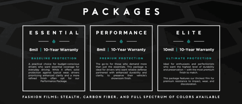 This year, we expanded our lineup to include three expertly designed PPF packages — Essential, Performance, and Elite — giving drivers the freedom to choose the exact level of protection and coverage they want, while all backed by 10-year warranties.